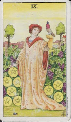 The IX of Pentacles relates to the name 77 / 14 / 5, and suggests the mystical, the 'Healer' and the 'Master of Delightful Energies'. This energy delves clothed in the Ubiquitous good sense for its answers in order that he may bring sensation that is to be join with others. This energy can as well as be burdened upon and used for healing.